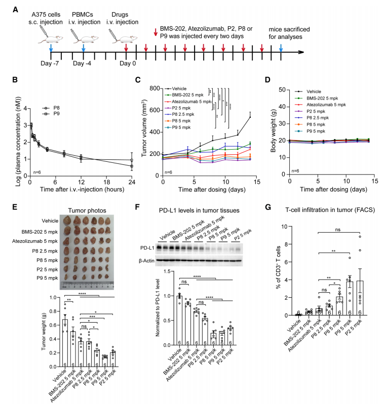 代表性化合物在小鼠体内展现出显著的抗肿瘤疗效,伴随肿瘤组织中PD-L1蛋白的显著下调及T细胞浸润增强。