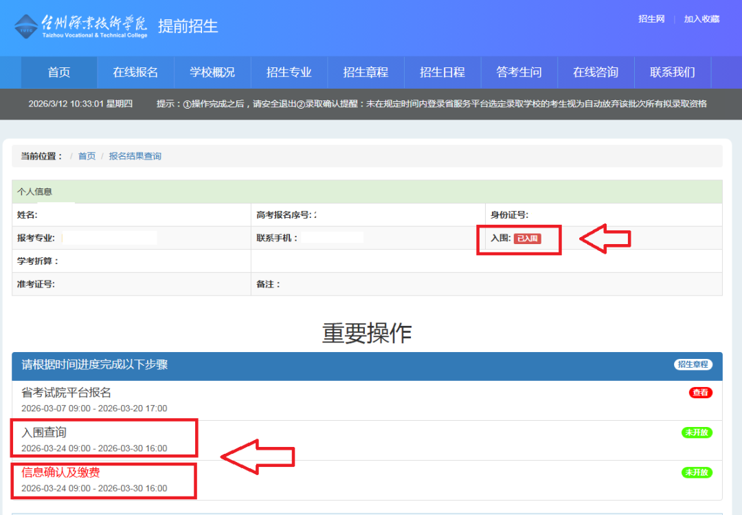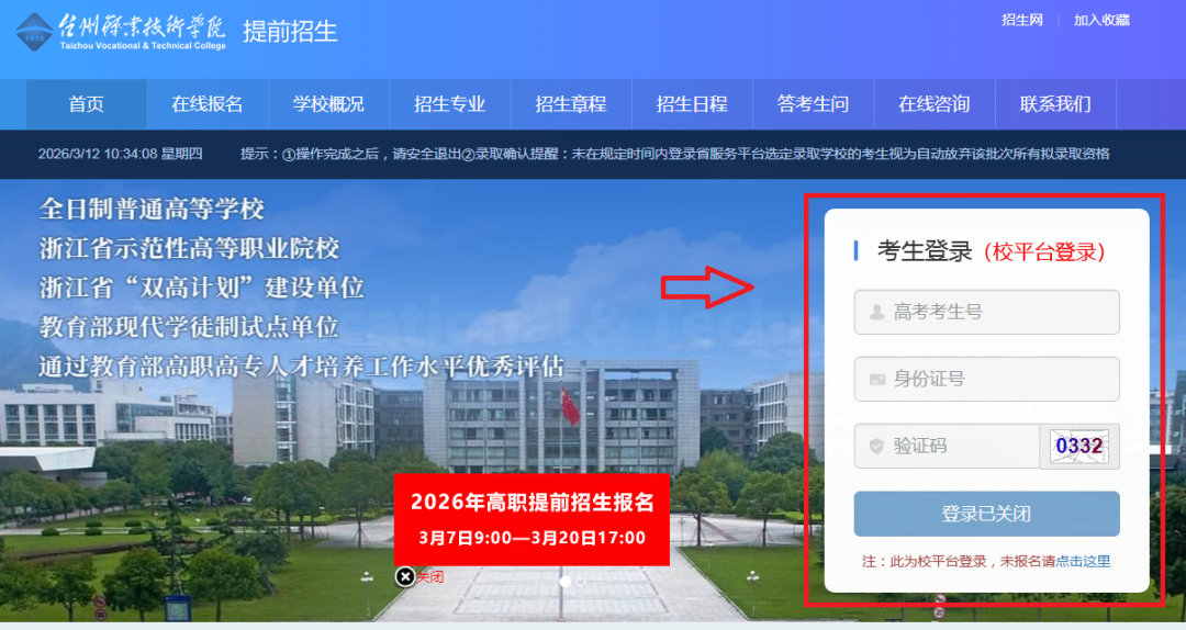 考生可于2026年3月24日登录我校提前招生网(https://zzzs.tzvtc.edu.cn/)查询,具体查询方法如下: