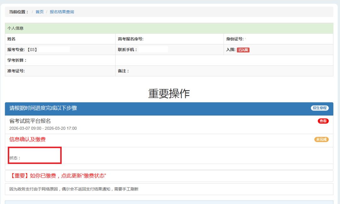 1. 入围考生按重要操作提示,点击“信息确认及缴费”按钮,进入信息确认界面,查阅并确认本人信息是否准确,无误则点击“信息确认无误”按钮。