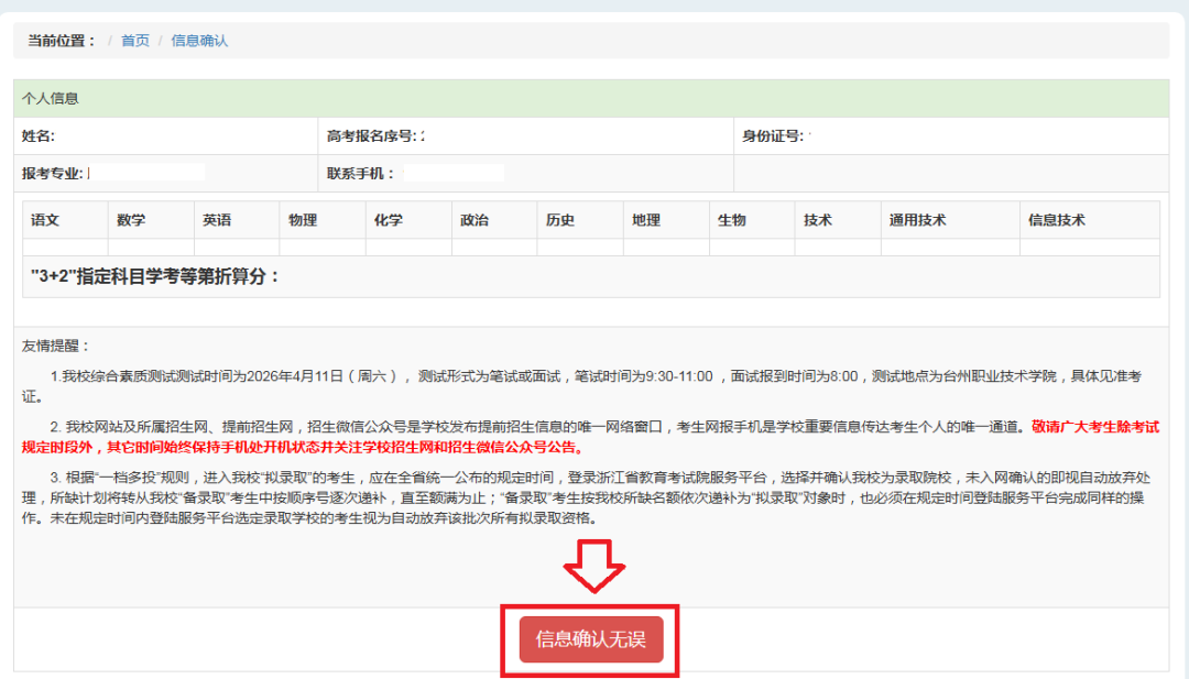我校2026年提前招生报名环节已结束,根据《台州职业技术学院2026年高职提前招生章程》规定,学校已按各专业招生计划数的500%确定综合素质测试入围考生名单(末位同分考生同时入围)。现将入围分数线、缴费等有关事项公告如下: