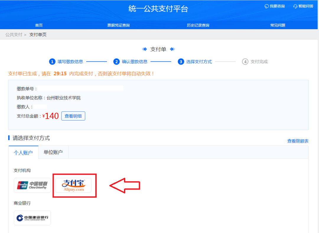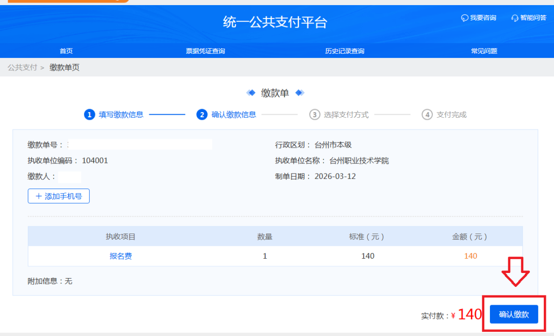 2. 确认相关信息后,点击“我已了解相关信息,并同意在线缴费”,跳转到浙江政务服务网,点击“确认缴费”。
