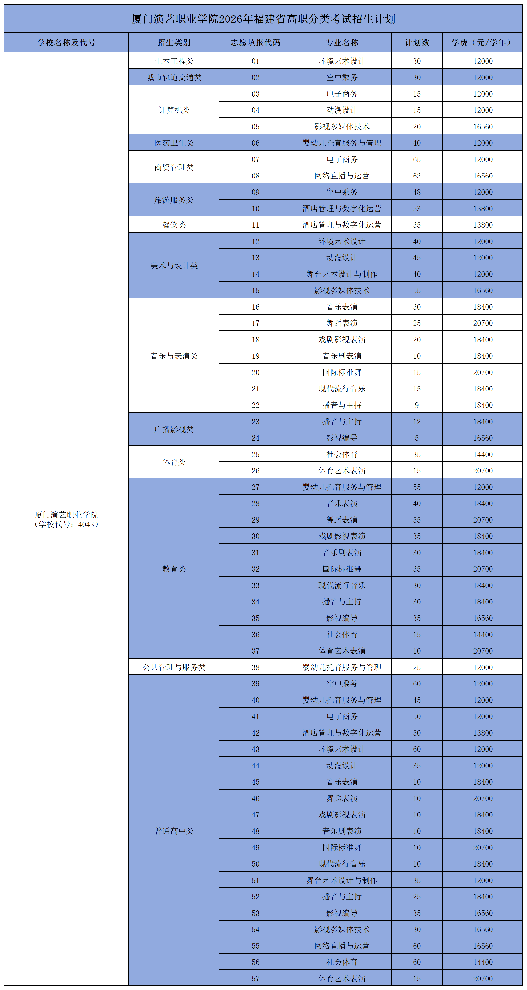 厦门演艺职业学院2026年福建省高职分类考试招生计划