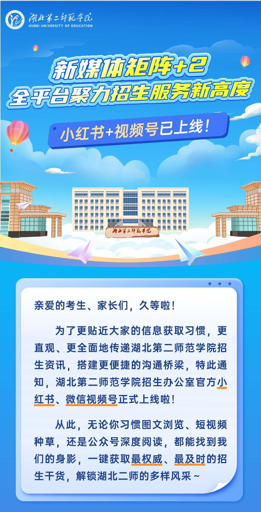 不止新上线的小红书和视频号,湖北第二师范学院招生办公室已构建起全方位、多层次的新媒体矩阵,各平台分工明确、协同发力,只为给你最贴心的招生服务,助力每一位追梦人顺利抵达湖北二师。