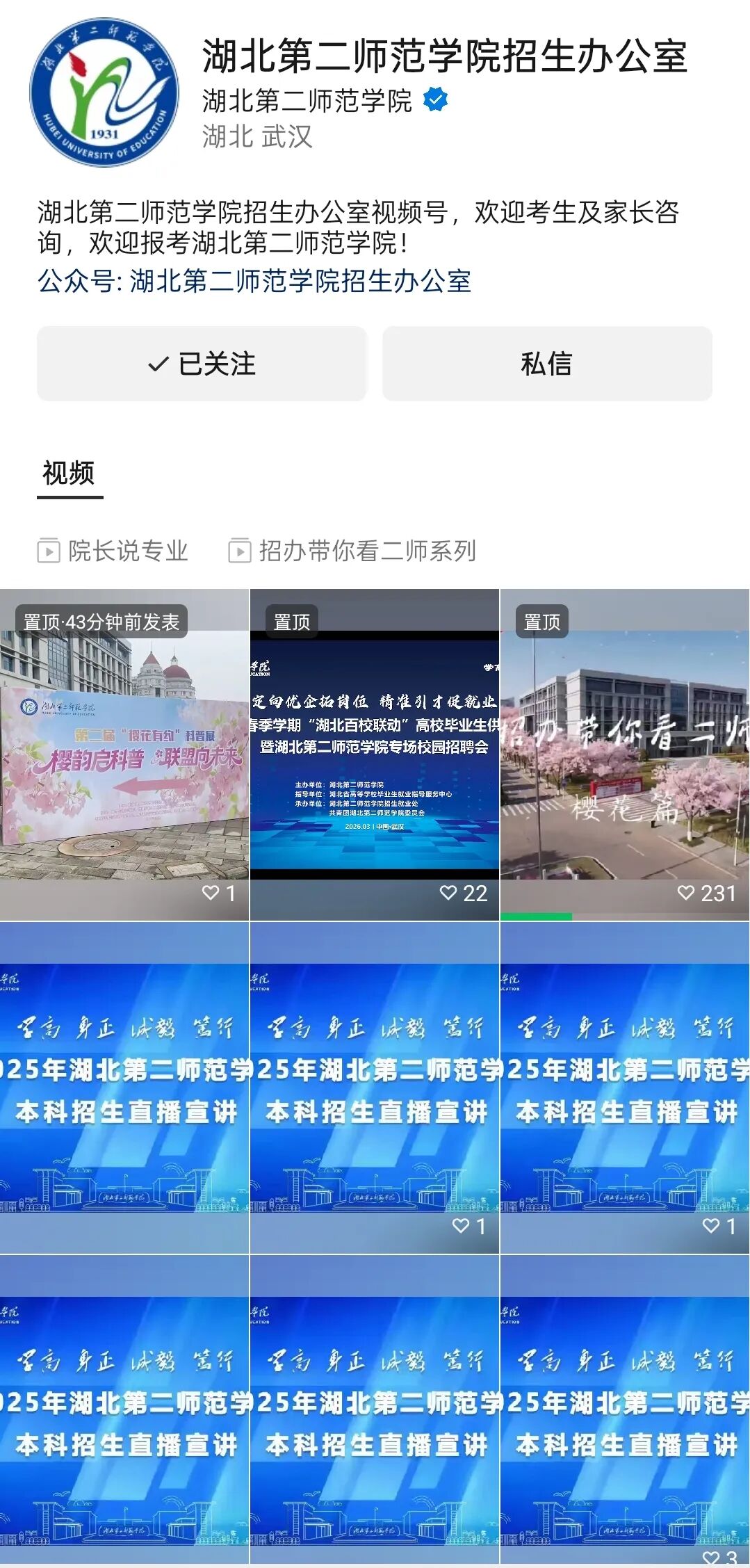 这里有鲜活的校园实拍——漫步林荫道、探访教学楼、解锁食堂美味,让你沉浸式感受湖北二师的校园氛围;有干货满满的短视频解读——招生政策拆解、专业特色介绍、学长学姐经验分享,用生动画面帮你扫清升学困惑;还有实时直播预告,招生老师在线答疑,手把手指导志愿填报。