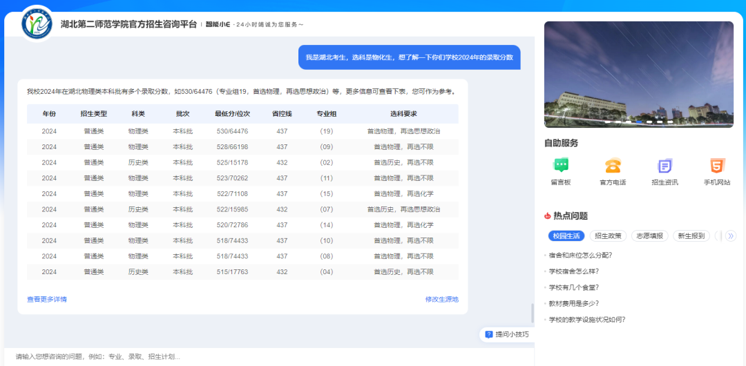2.AI智能招办:点击公众号下方菜单栏“招生咨询”栏目“AI智能招办”,可24小时在线解答常见招生疑问。