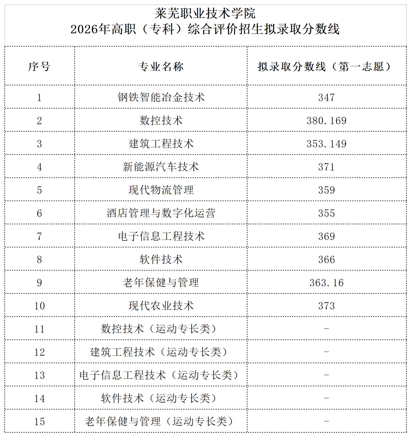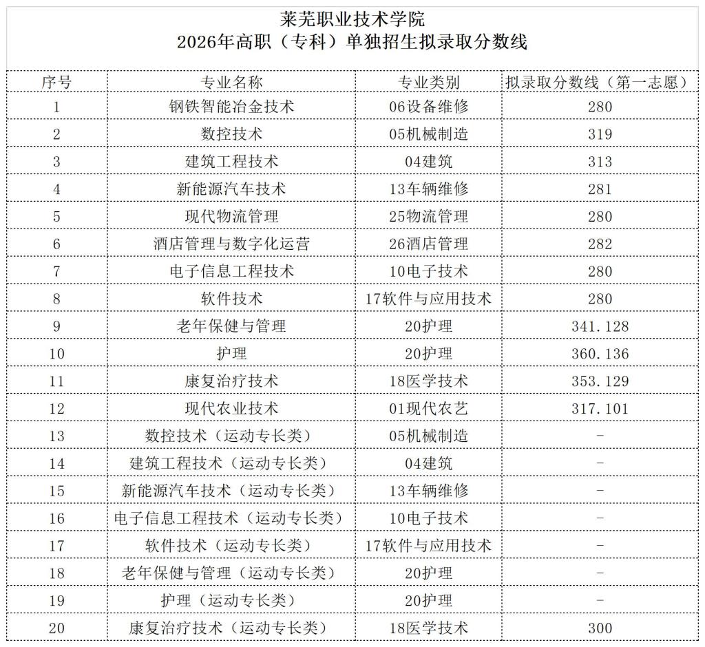 莱芜职业技术学院2026年单独招生、综合评价招生拟录取分数线