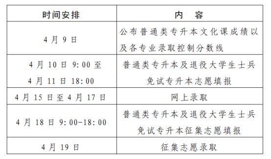 4月15日至4月19日进行普通类专升本和退役大学生士兵免试专升本录取。