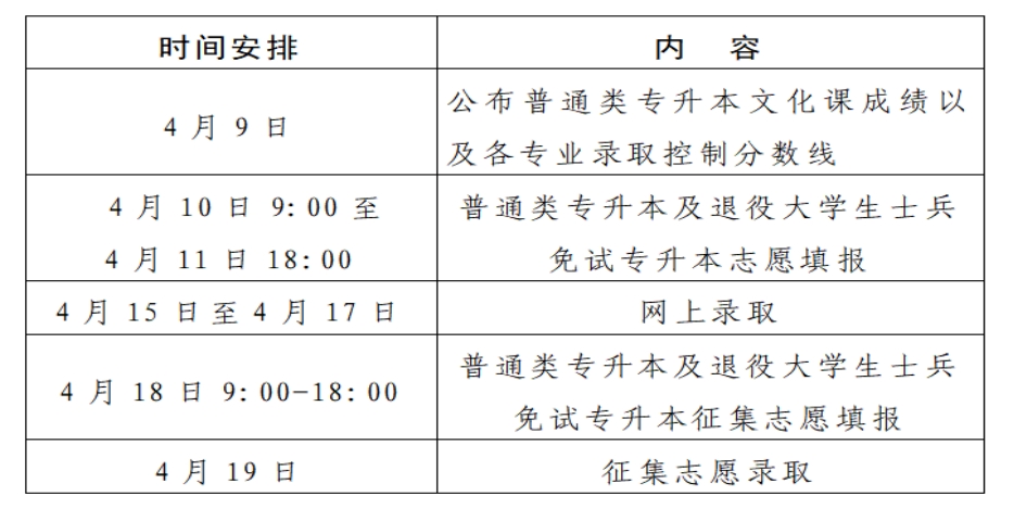 4月15日至4月19日进行普通类专升本和退役大学生士兵免试专升本录取。