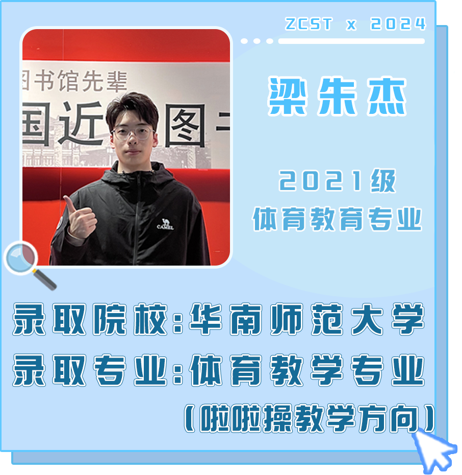 “导师们倾囊相授的师道精神、训练时流淌的汗水与热血、成功上岸华师,在珠科,我收获了太多,也成长了太多。如果要用三个词总结我的珠科生活,我选择‘传承、炽热、蜕变’。学弟学妹们,机会是留给有准备的人,计划再周密,不行动也是纸上谈兵!我们学校以及老师,为了我们的未来已经保驾护航了很久很久,就差我们自己的行动啦!学弟学妹们,快快行动起来吧!” ——梁朱杰
