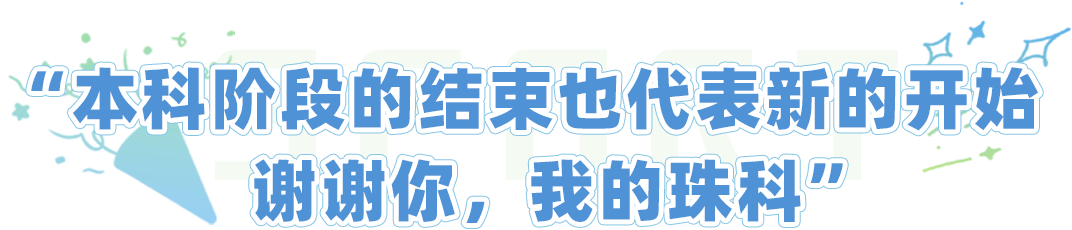“感谢大学四年给予我支持的每个人。本科阶段的结束也代表着新的阶段的开始,我将在读研期间持续发掘自己的可能性,让更多的人看到珠科学子的风貌,为我的母校争光!我也想告诉学弟学妹们,努力和汗水是这条道路上最重要、最不可或缺的。学会沉下心来的付出,才能收获花开。” ——丁明轩