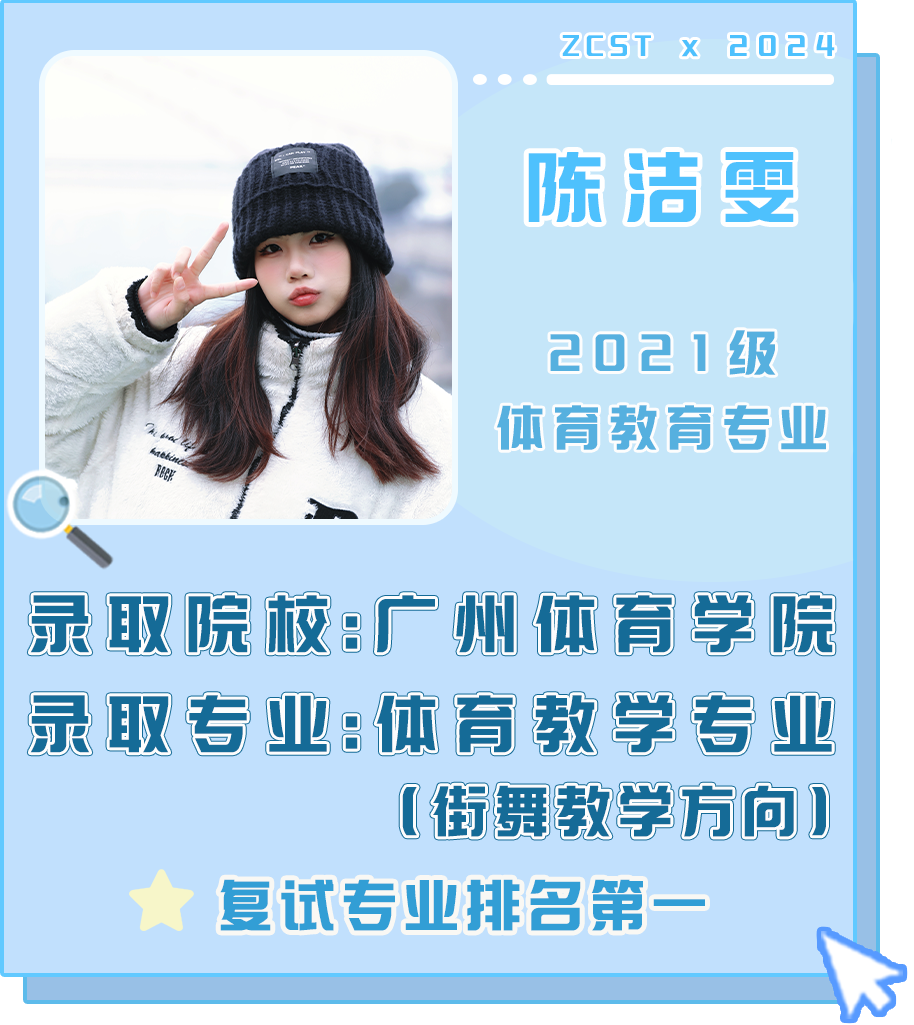 “非常幸运在珠科遇到林院长、张老师、李老师,虽然在校只有短短一年,但良师们的人格魅力使我体悟到许多道理。未来我也将深耕体育教学专业,将街舞等特色专项融入其中。学弟学妹们,人生不是轨道,而是旷野,只有努力才能走得更远。相信你们能收获属于你们的精彩。” ——陈洁雯