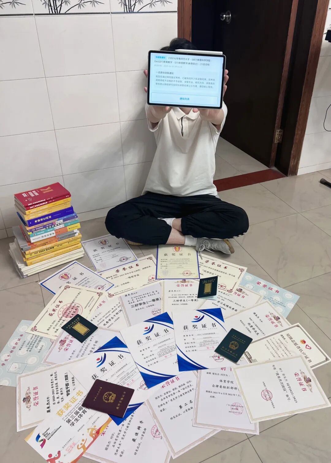 “我时常会为自己不能按时按质按量完成任务而焦虑,时常为那三本厚厚的专业书、永远看不懂的长难句、永远两选一还错的英语阅读、永远审不清题的政治选择题而不安。”带着对上岸后日子的憧憬,梁朱杰始终告诉自己,要再坚持一次,给时间一点时间,让自己突破自己,最终顺利进入复试。“然而在备考复试时,我感冒了半个多月。”每天迷迷糊糊地背书,拖着疲惫的身体备考,那段时间梁朱杰也曾迷茫过。“华师复试阶段被刷的人那么多,我应该没希望了吧?”与此同时,这句话常常萦绕在他耳边。“直到有一天在自习室醒来,我发现周围的人都在埋头苦学着;去到舞蹈室,我又看见师弟师妹们在努力训练,同样在备考的丁明轩也来给我加油打气。这种种又让我拾起了最初的热血,志存高远,为什么我不能是那匹上岸的黑马呢?”身边人的感染和鼓励,让梁朱杰振奋士气,他通过跑步提高身体免疫力,打起精神完成自己的每日计划,在不断坚持的积累中找回了上岸的信心。
