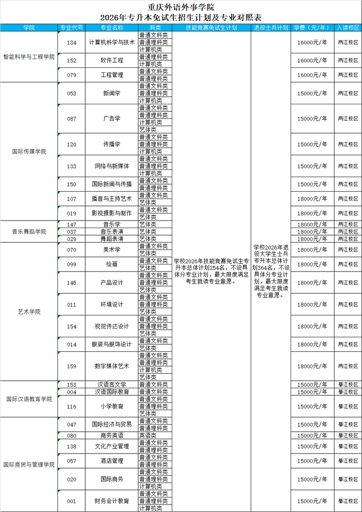 我校2026年专升本免试生不设分专业计划,将最大限度满足考生的就读意愿,退役大学生士兵招生计划364名,技能竞赛免试生招生计划254名,招生咨询电话:023-88791222/88791333。具体招生专业信息如下: