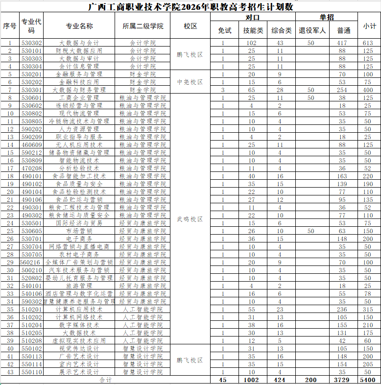 广西工商职业技术学院2026年职教高考招生计划数