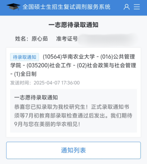 ▲原心茹的一志愿待录取通知