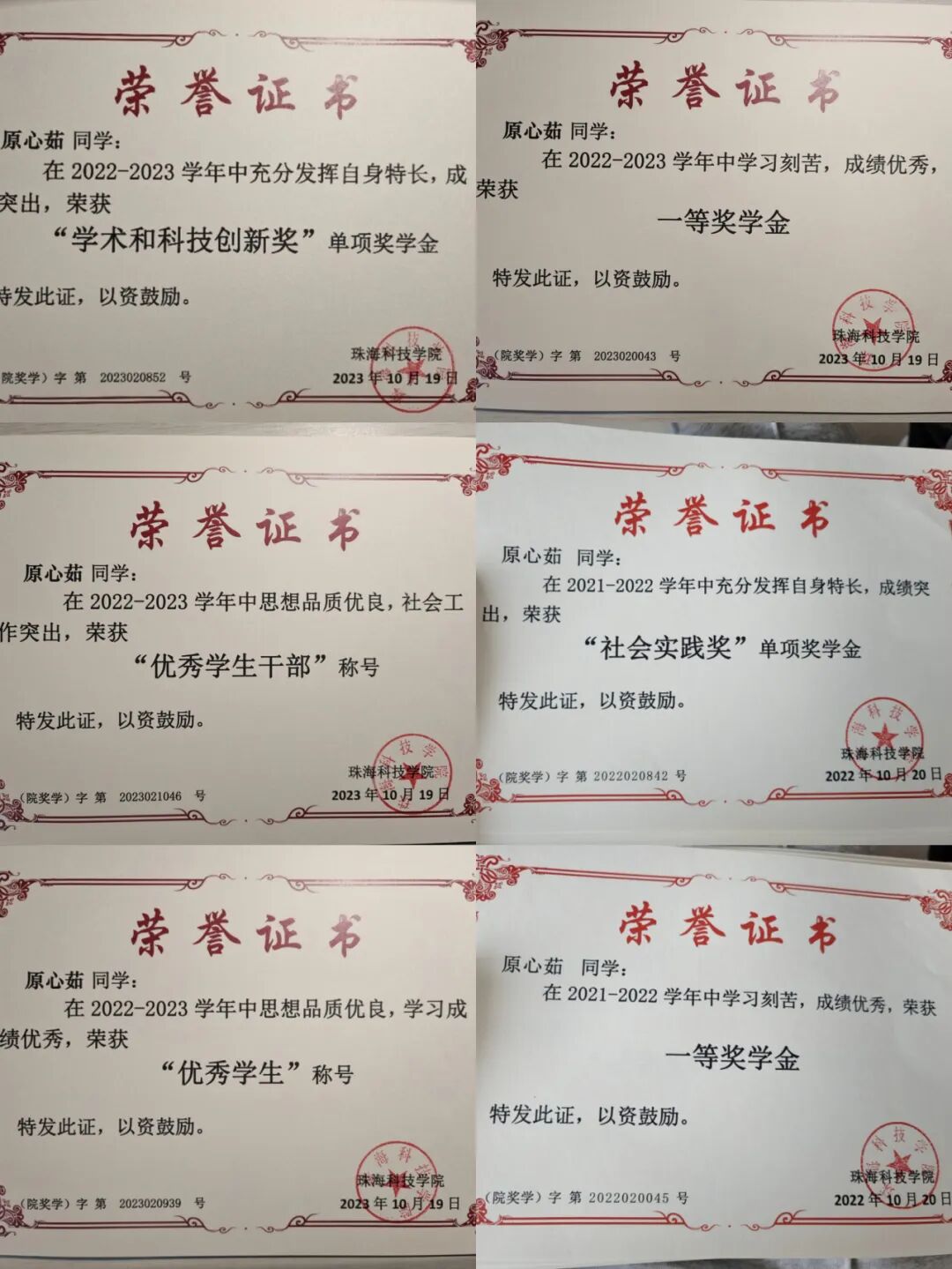 ▲原心茹本科获奖证书(部分)