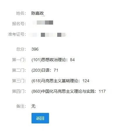 ▲陈嘉政考研初试成绩