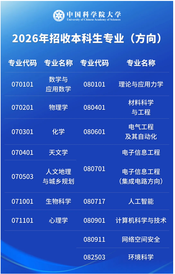 2026年国科大共16个专业(方向)招收本科生,具体专业如下:
