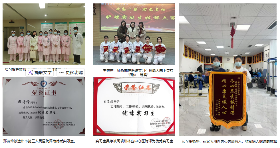 应届毕业生牟桂湘被四川省人民医院东篱医院录用工作;袁雪美、陈伯露、崔新雨、周思宇被成都市第二人民医院录用工作;林意翔被南充市中医院录取工作。学院已经向社会输送了大批量优秀护理人才,毕业生遍布各地,其能力和素质均受到用人单位好评。