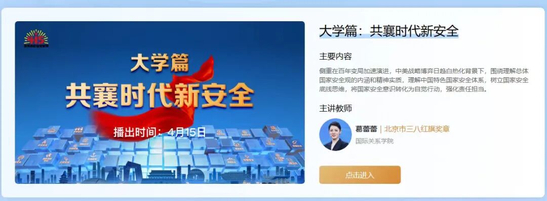 4月15日起,小学课程“话说身边安全事”、初中课程“解码大安全理念”、高中(中职)课程“理解总体安全观”、大学课程“共襄时代新安全”同时播出。