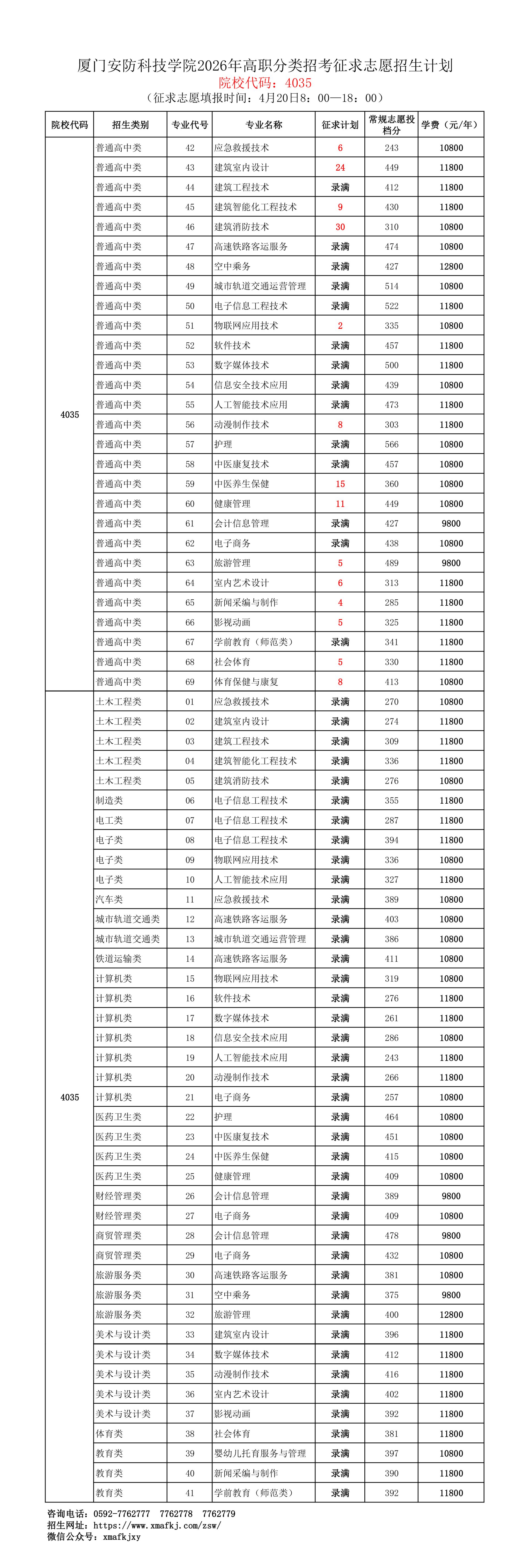 厦门安防科技学院2026年高职分类招考征求志愿招生计划