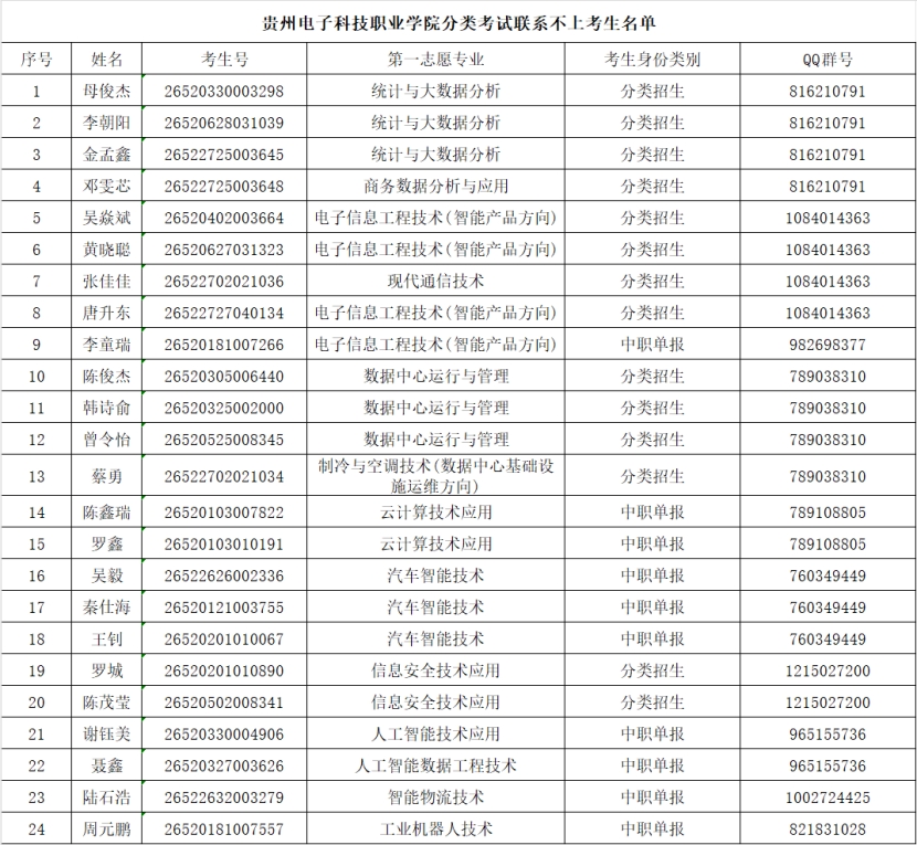 根据贵州省招生考试院下发的2026年高职分类招生考试的考生数据,我校通过发布公告、电话短信联系等方式通知符合资格考生参加我校第二轮职业技能(适应性)测试,其中有24名考生因电话手机停机、关机、无人接听、手机空号等原因,经我校教师反复联络后依然无法与本人取得联系,具体名单如下。