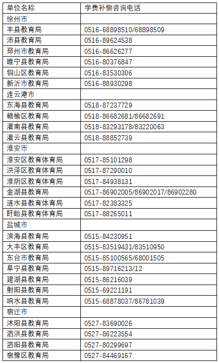 申请江苏省高等学校毕业生学费补偿政策时如有疑问,请与就业地县(市、区)学生资助管理中心联系,咨询电话如下: