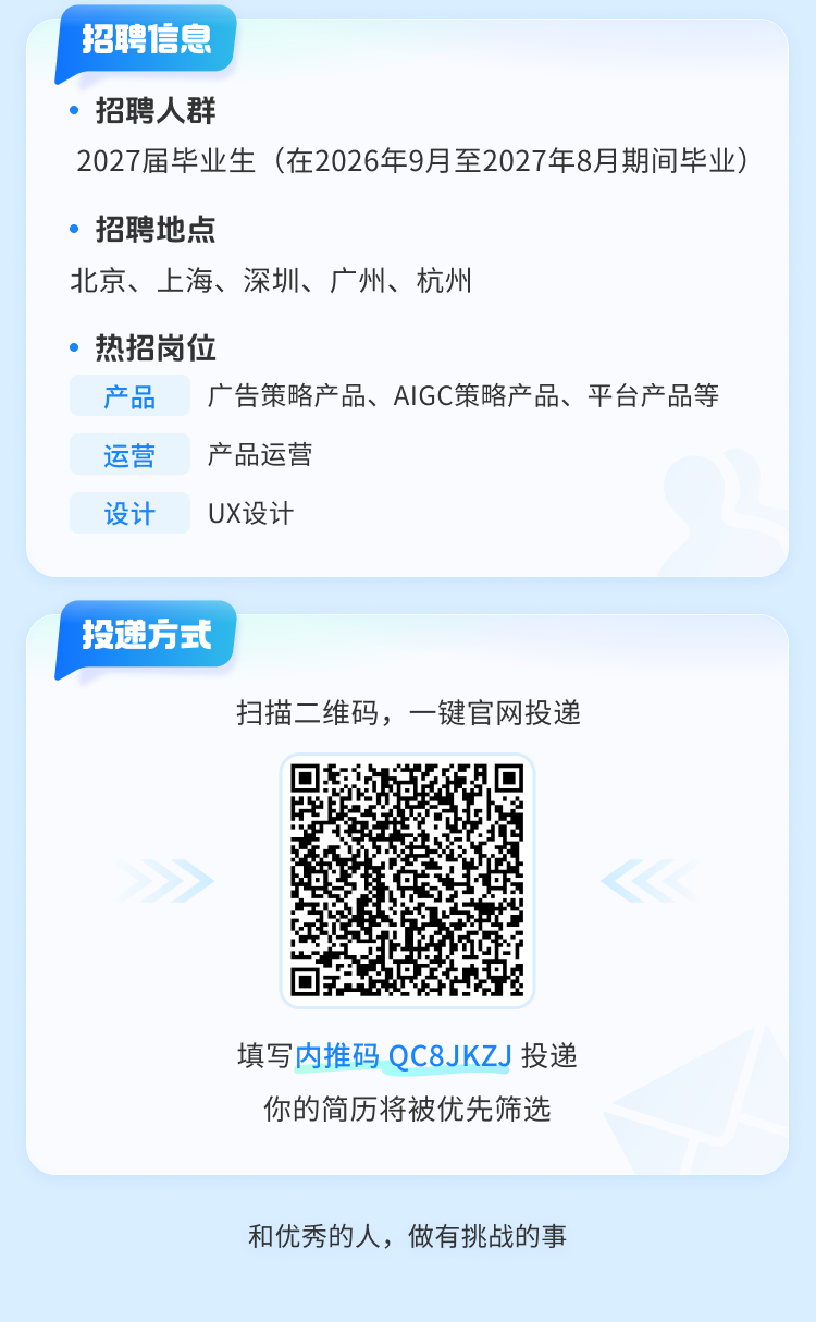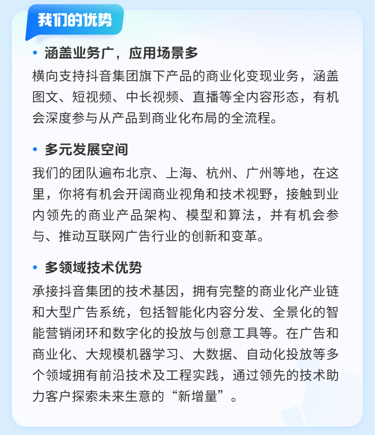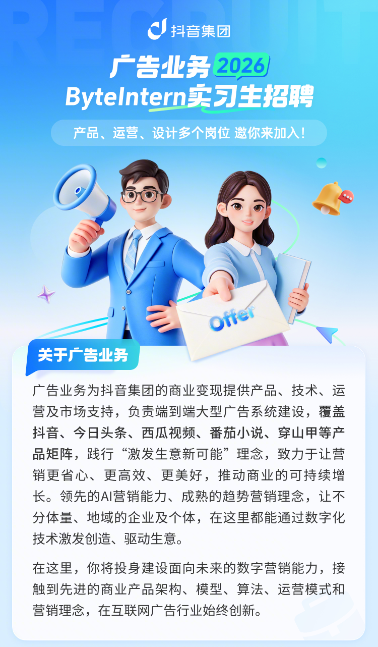 抖音集团广告业务 ByteIntern 实习生招聘中,产品、运营、设计等多个岗位,邀你来加入!