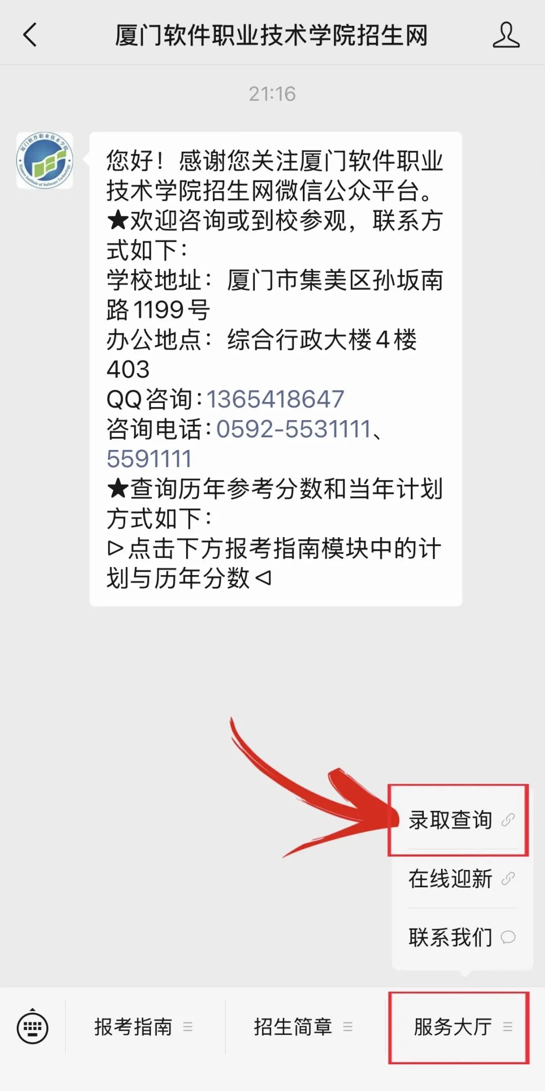 1、关注公众号后,点击右下角服务大厅,然后点击录取查询。