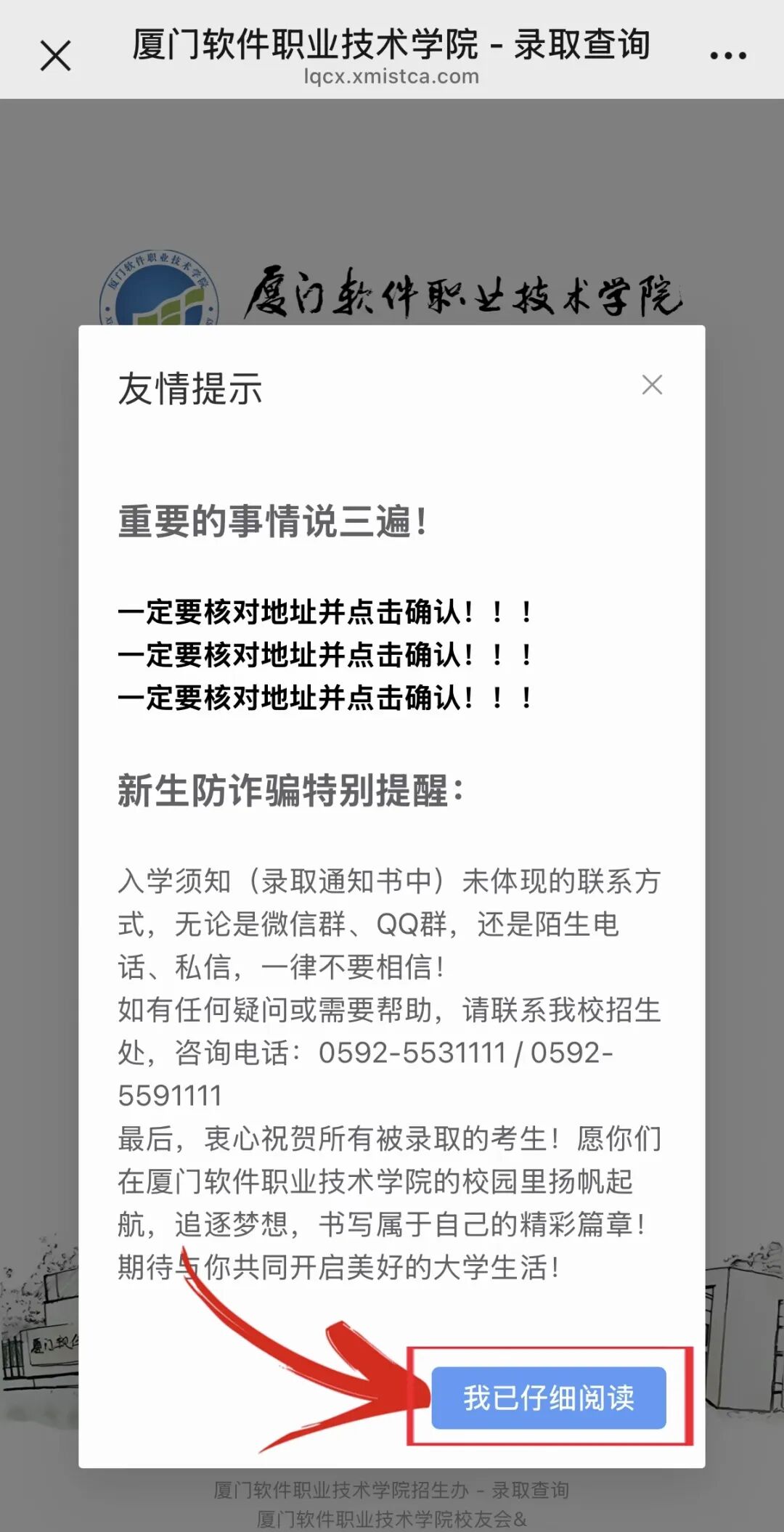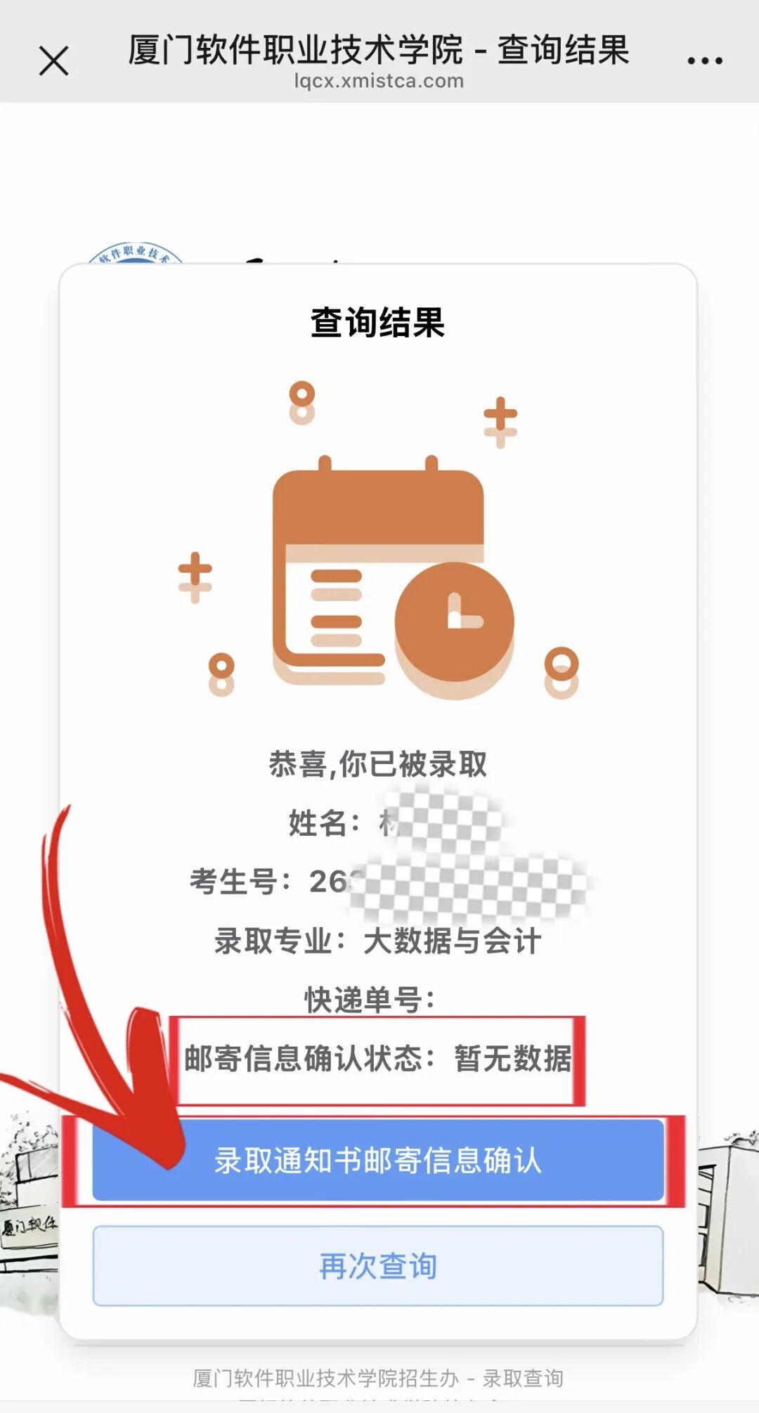 4、若查到已被我校录取的信息,请点击下方录取通知书邮寄信息确认,有误的请及时更改,需具体到省市区/县...门牌号。