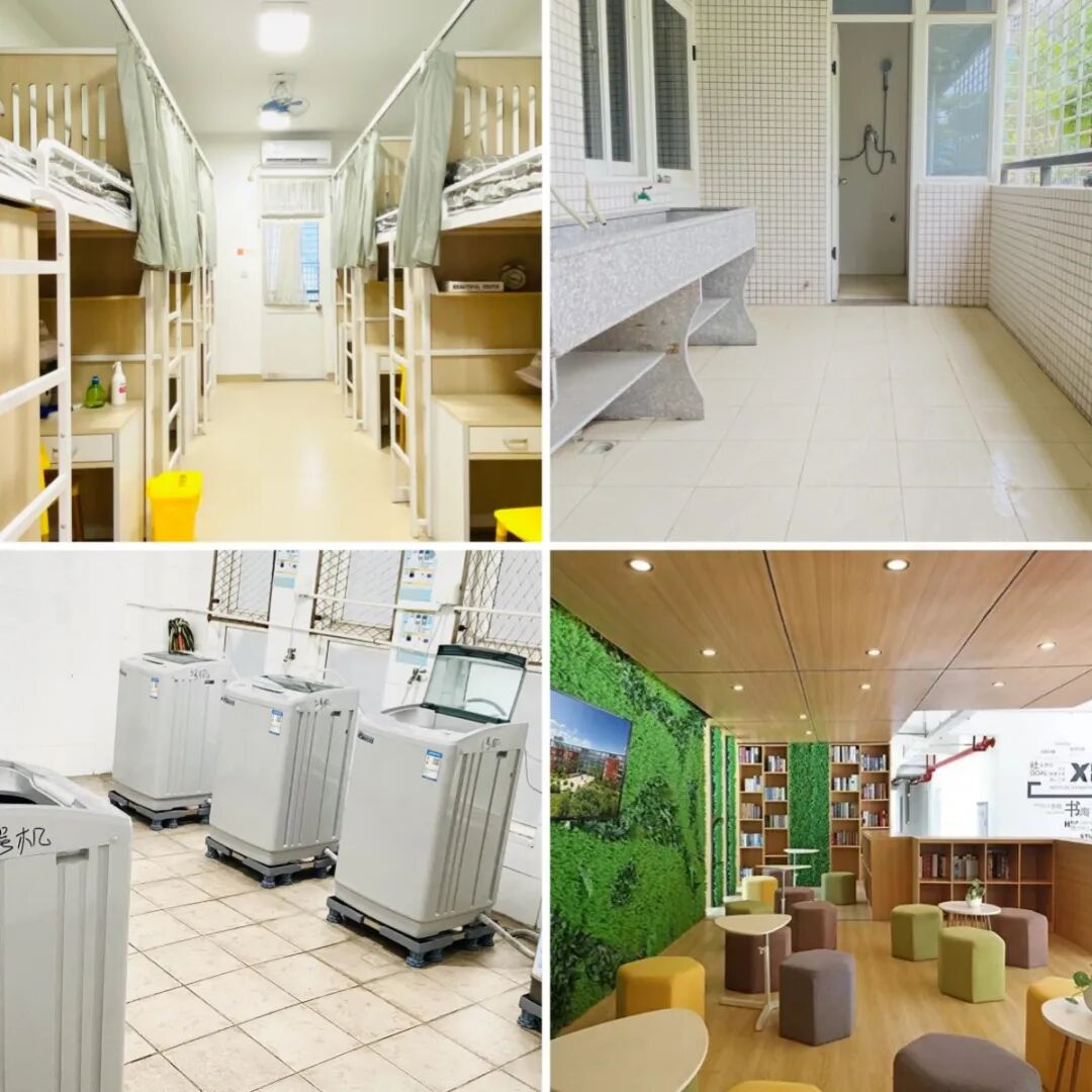 学生宿舍是标准公寓的园林宿舍,六人一间,上床下桌,独立阳台卫浴,配有空调、风扇、洗衣房等设施。住宿费只需1400元/年。