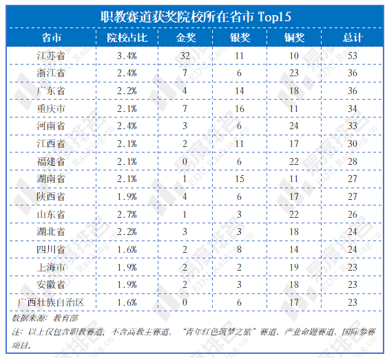 浙江省与重庆市虽金奖数并列,但获奖结构特征迥异:浙江省的铜奖数量明显偏多,而重庆市则银奖数量更为突出,两省市在职教赛道中的表现均优于其在主赛道中的相对排位。