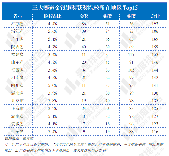 本届大赛在高教主赛道、“青年红色筑梦之旅”赛道和产业命题赛道中,江苏省、浙江省、广东省位列获奖总数前三名。
