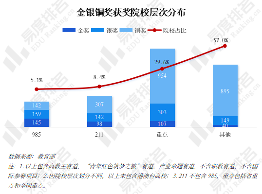 其中重点高校(含省重点与全国重点)院校占比29.6%,金奖107个、银奖303个,整体获奖体量最大,是大赛获奖成果的重要贡献群体。