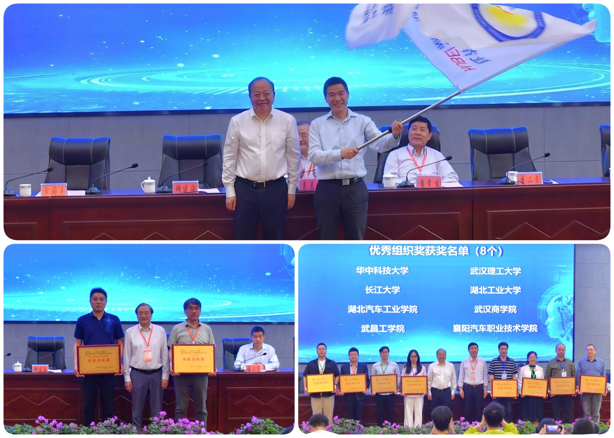 4月19日下午,2026年“乐聚杯”湖北省大学生机械创新设计大赛暨第十二届全国大学生机械创新设计大赛湖北省省赛闭幕式举行。吴昌林教授宣布湖北赛区获奖名单和拟推荐国赛的排序名单,并为获得特殊贡献奖的单位颁奖。童幸生教授宣读大赛 “特殊贡献奖”“优秀组织奖” 获奖名单。童幸生教授、方国平教授分别为获得优秀组织奖的单位颁奖。方国平教授代表本届承办单位向下一届承办单位——江汉大学副校长李卫东教授交接会旗。
