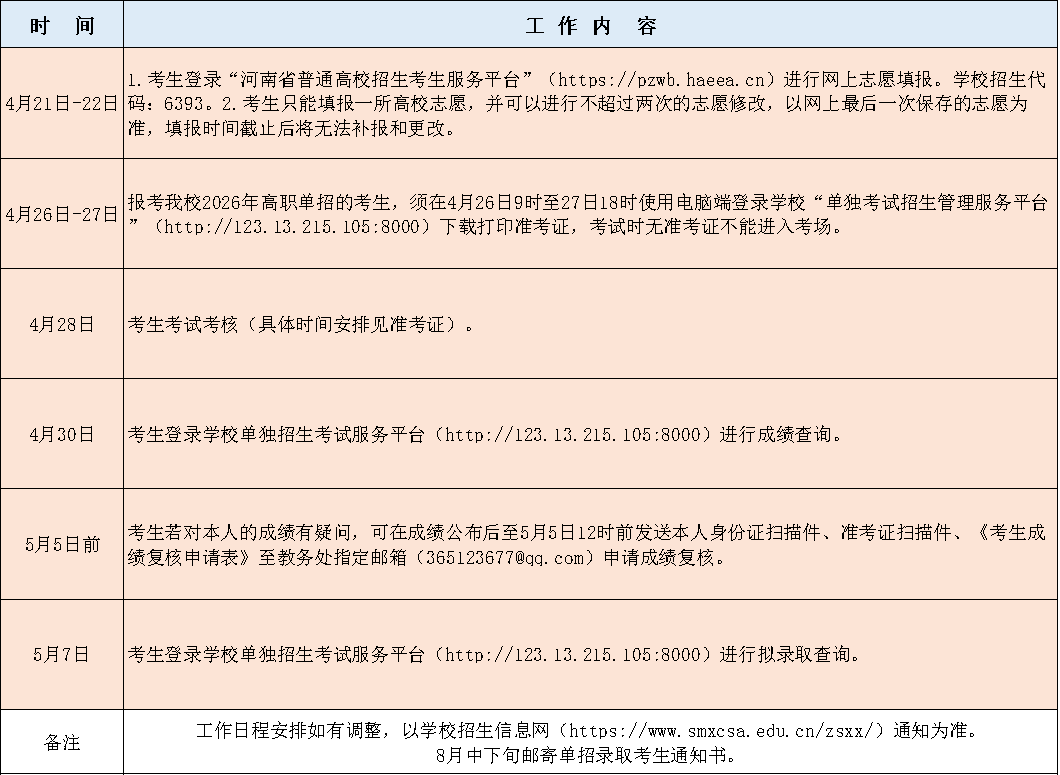 三门峡社会管理职业学院2026年单独考试招生工作日程安排(近期)