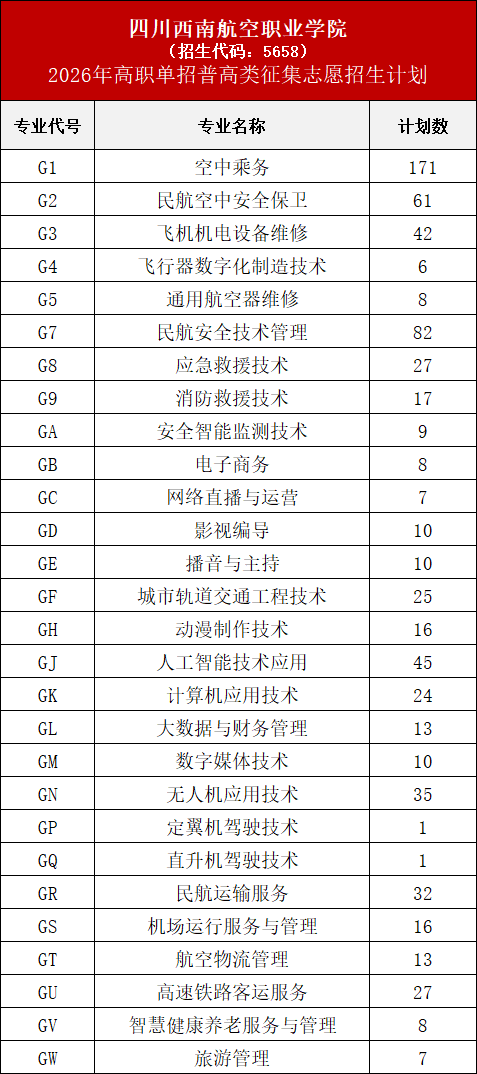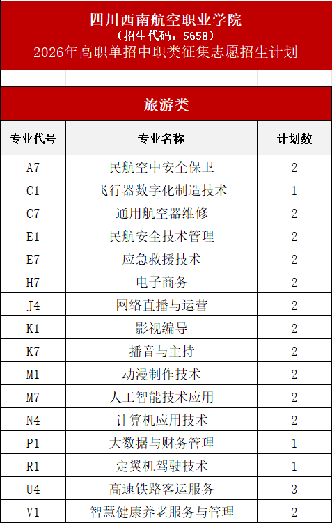 四川西南航空职业学院是经四川省人民政府批准,国家教育部备案,纳入国家招生计划的以民航教育为特色的综合类全日制高职院校,在校学生超20000人,共有成都国际职教城东区、西区两个区。学院专业设置覆盖航空全领域,坚持与民航行业标准无缝对接,聘请来自航空安全、民航飞行、空中乘务、机务维修、机场管理等领域拥有数十年行业经验的专家任教,并与国际国内顶尖院校签订战略合作协议,确保学院师资水平行业领先。
