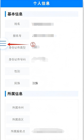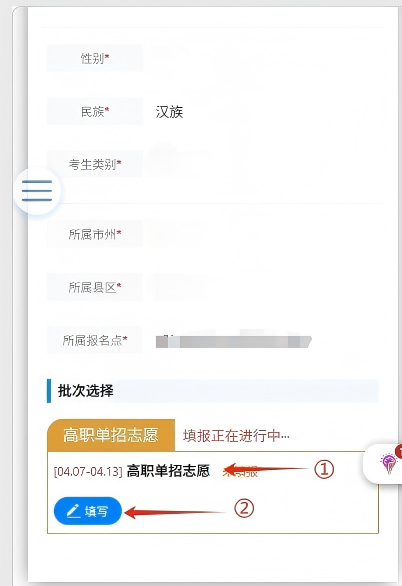 步骤三:点击左上方标记①悬浮菜单图标,打开菜单。菜单展开后,再点击标记①“志愿填报”进入批次选择页。