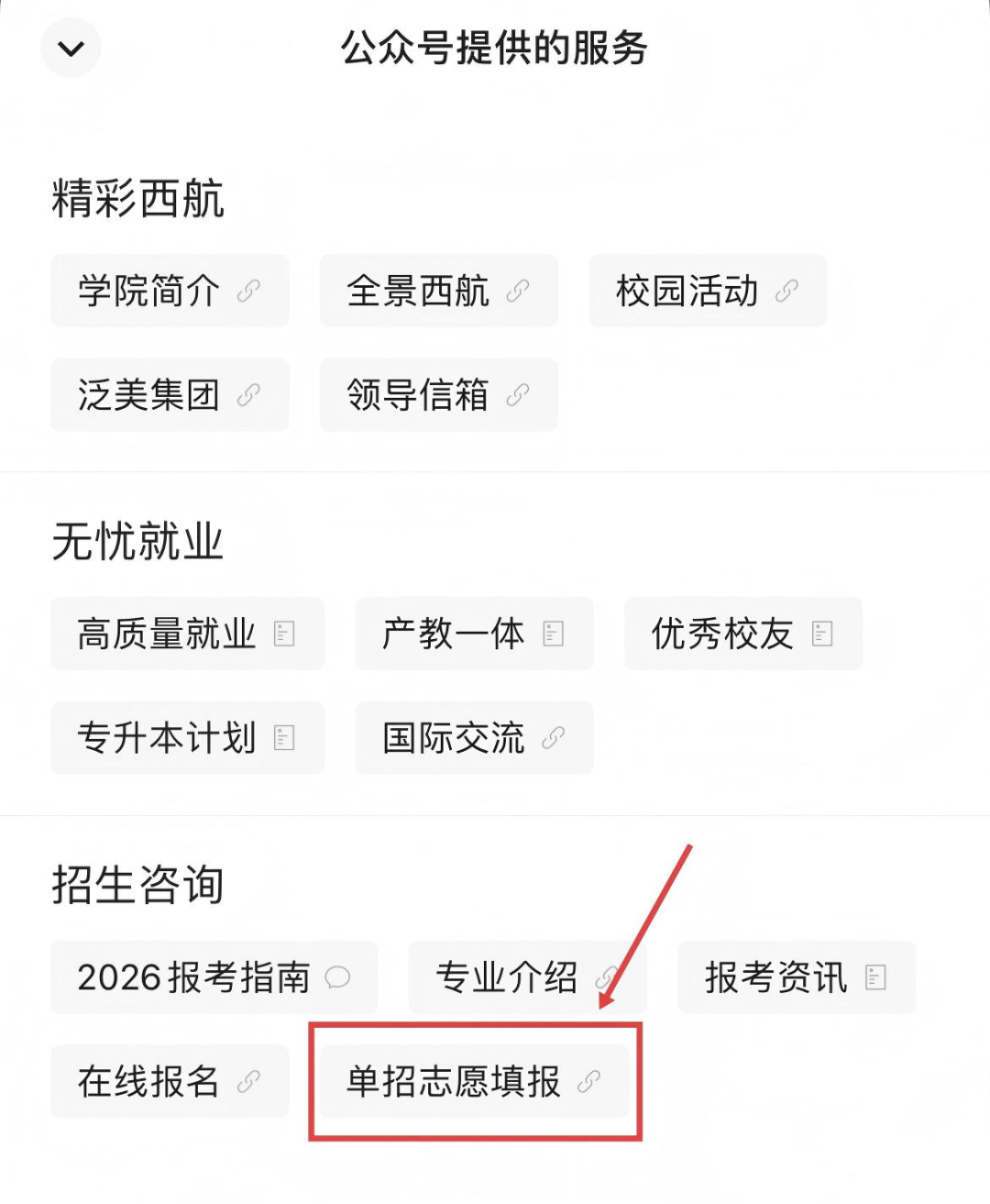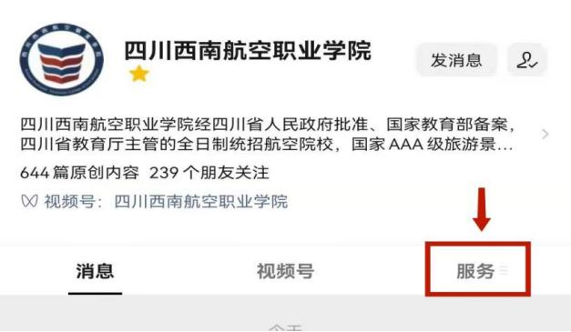 微信搜索“四川西南航空职业学院”公众号,点击标题栏最右侧“服务”,在下拉栏中选择“单招志愿填报”