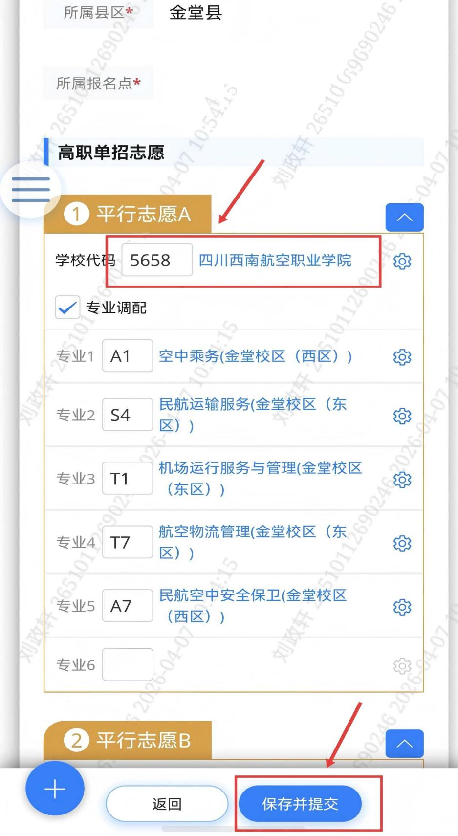 步骤六:此次高职单招志愿填报设置9个平行志愿,每个学校志愿内设置6个专业志愿及专业调配志愿,录取方式采取次位优先、遵循志愿、一轮投档的投档原则;拿四川西南航空职业学院举例:在学校代码处输入“5658”即可出现“四川西南航空职业学院”名称;下设6个专业,同学可根据自己报名时选择的类别去选可以填报的专业;填写完毕后勾选右上角的“专业调配”;确认填报无误后一定要点击下方“保存并提交”;