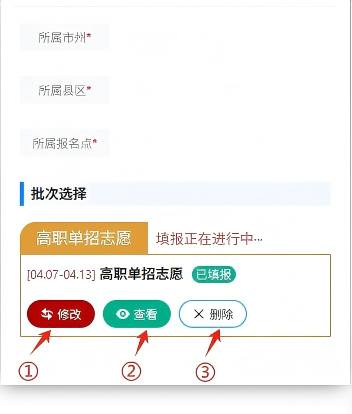 步骤九:如需修改志愿表以及查看志愿表,可以在批次选择页中找到当前批次标题,点击标记①“修改”按钮修改志愿,点击标记②“查看”按钮查看志愿,点击标记③“删除”按钮删除当前填写的志愿。 专注航空教育32年,覆盖航空全领域,聚焦新兴前景行业行业领先师资水平,为您保驾护航优质就业服务,助您高质量就业行业权威资质,提升您的核心竞争力硬核产教一体,让您与行业零距离接触高质量升学服务,圆您本硕求学梦高质量技能培养,圆您“大国工匠”梦…… 咨询电话:400-867-9992,欢迎报考四川西南航空职业学院,成为青春的主角,奏响未来协奏。