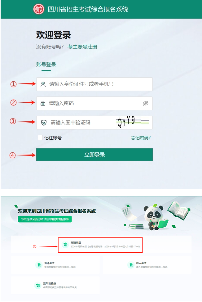 步骤一:依次在图中标记①输入身份证件号或者手机号,在标记②正确填写密码,在标记③正确输入图片中的验证码,④“登录”按钮可用后点击“立即登录”按钮,登录系统。登录成功后点击标记⑤,进入高职单招志愿填报系统。