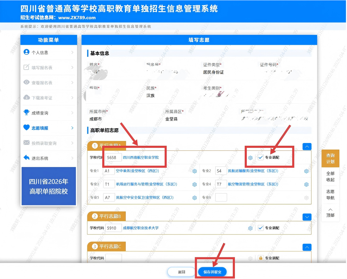 步骤七:根据查询到的计划信息,在填写志愿页面中填写志愿信息。此次高职单招志愿填报设置9个平行志愿,每个学校志愿内设置6个专业志愿及专业调配志愿,录取方式采取次位优先、遵循志愿、一轮投档的投档原则;拿四川西南航空职业学院举例:在学校代码处输入“5658”即可出现“四川西南航空职业学院”名称;下设6个专业,同学可根据自己报名时选择的类别去选可以填报的专业;填写完毕后勾选右上角的“专业调配”;确认填报无误后一定要点击下方“保存并提交”;