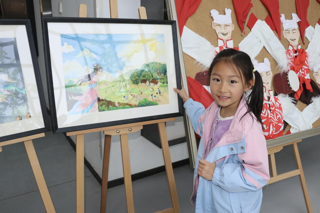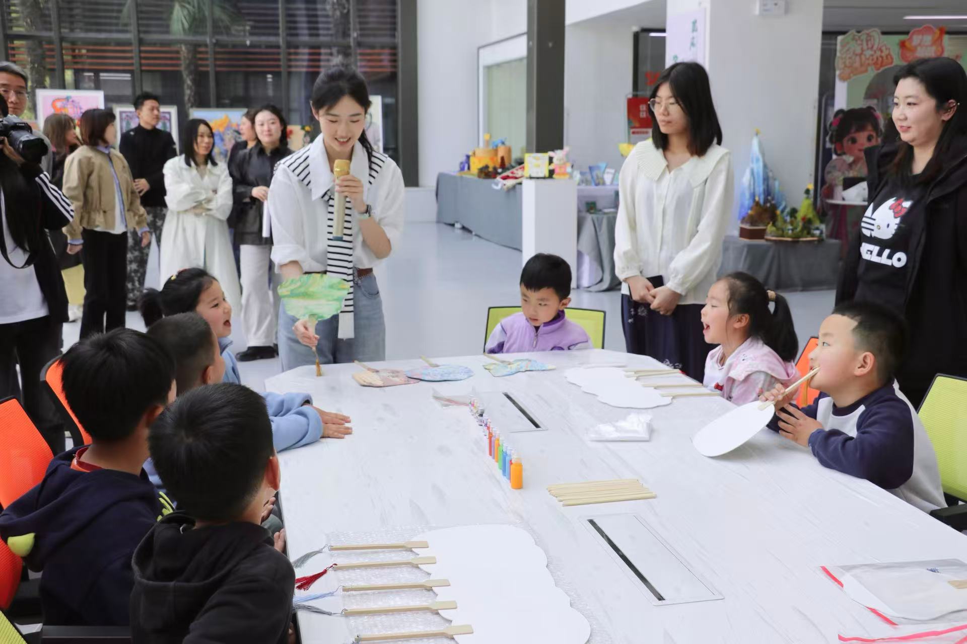 作为本次展览的核心亮点,“美育互动体验”环节让展厅成为充满活力的教学实践课堂。教育系学子化身“美育引导者”,带领前来观展的小朋友们体验水拓团扇制作、传统纹样解读、模型场景探秘等趣味活动。在水拓团扇体验区,学子们耐心指导小朋友们调配颜料、勾勒图案,让孩子们在动手实践中感受色彩的魅力;在作品展示区,学子们结合剪纸、绘画、模型作品,为小朋友们讲述传统文化故事、红色历史场景,引导孩子们发现美、感受美、表达美。互动现场,孩子们专注投入的眼神、完成作品时的笑脸,与学子们温暖耐心的引导相映成趣,构成了本次展览最动人的美育图景。这一环节不仅展现了学子们的教学组织能力与沟通表达能力,更搭建起高校与社会美育实践的桥梁,让毕业设计走出课堂、服务社会,实现了“教学成果转化、美育价值传递”的双重目标。