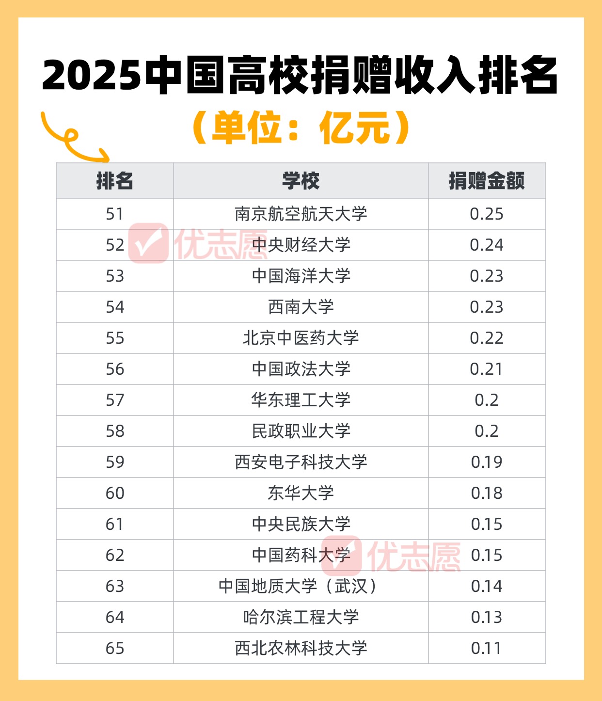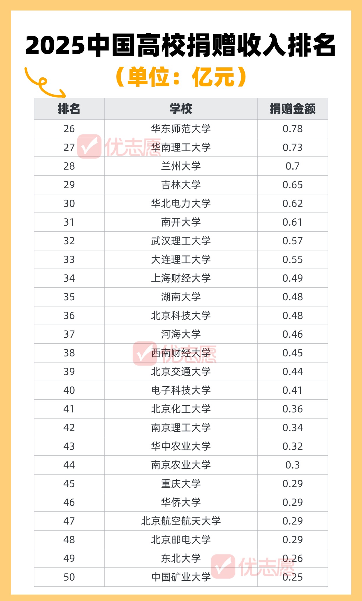 数据说明:1、来源于国家事业单位登记管理局《事业单位法人年度报告书(2025年度)》;2、数据为2025年度报告中的捐赠收入到账金额,按亿元单位四舍五入取值;3、信息手动收集整理,为不完全汇总,仅供参考。