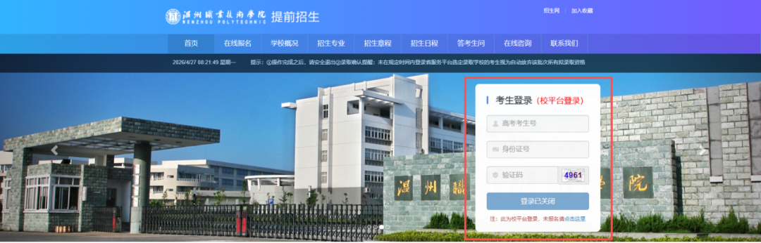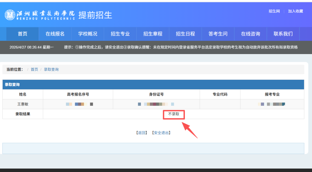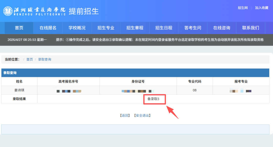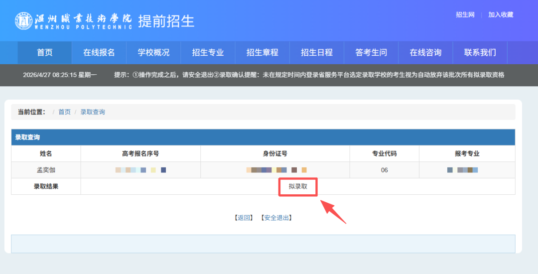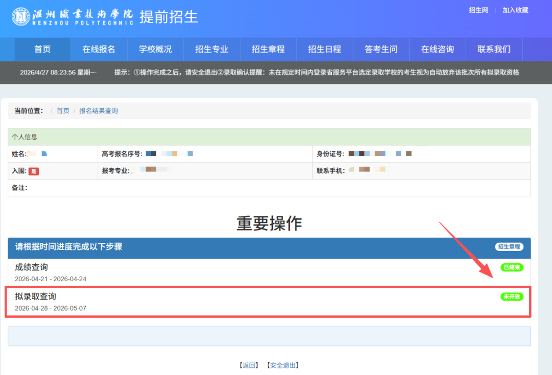 考生可在4月28日登录我校提前招生系统(https://tqzs.wzvtc.cn/)进行预录取状态查询。查询方法如下: