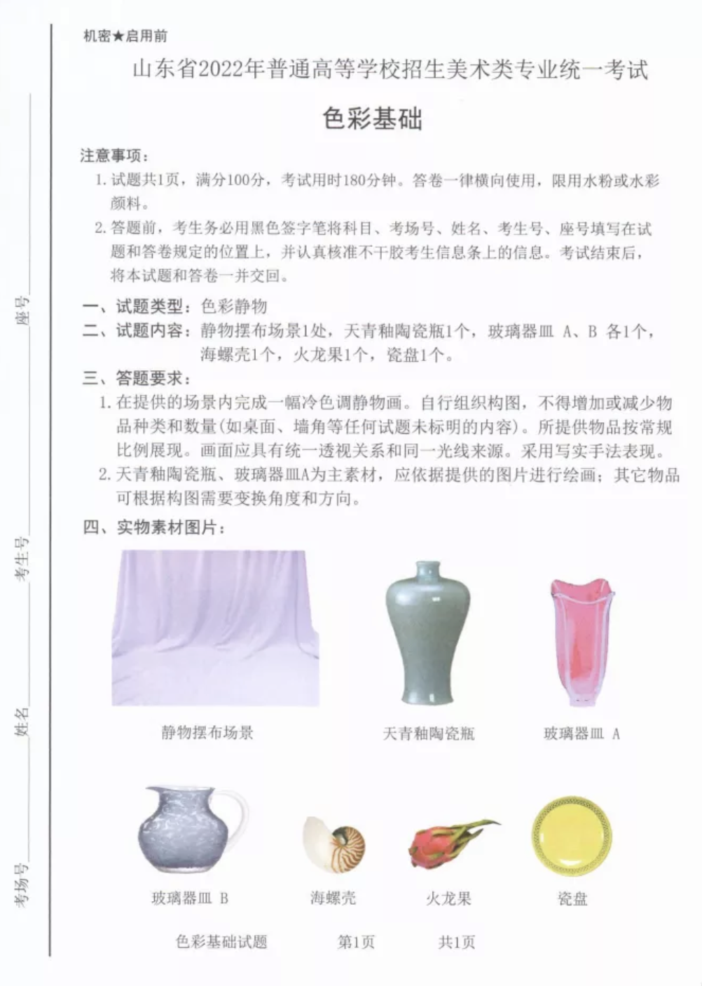 二、试题内容:静物摆布场景1处,天青釉陶瓷瓶1个,玻璃器皿A、 B各1个,海螺壳1个,火龙果1个,瓷盘1个。