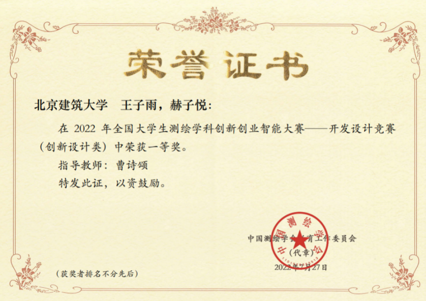 2022年全国大学生测绘学科创新创业智能大赛开发设计竞赛(创新设计类)证书