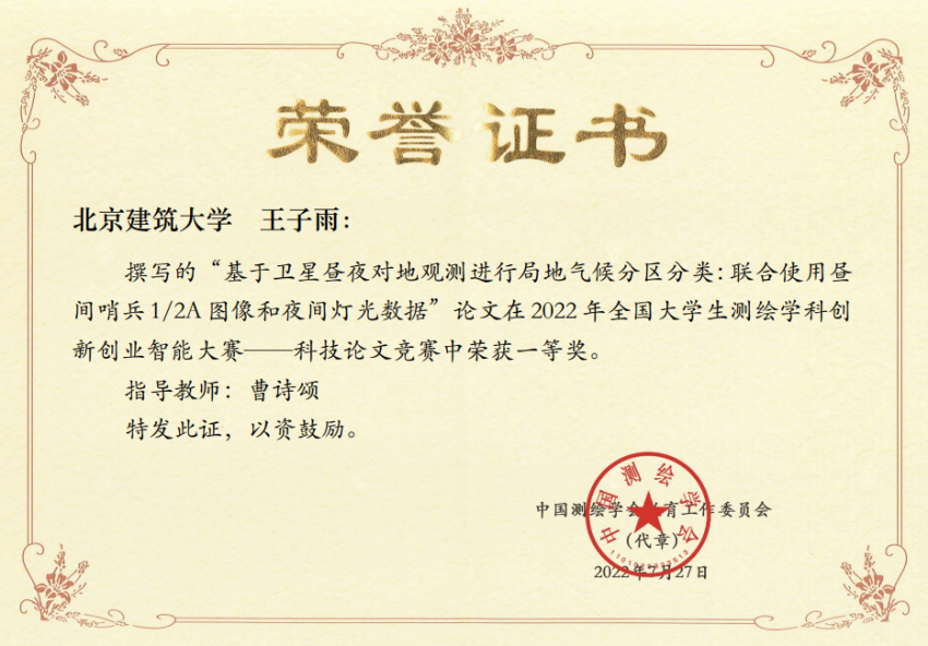 2022 年全国大学生测绘学科创新创业智能大赛——一等奖获奖证书