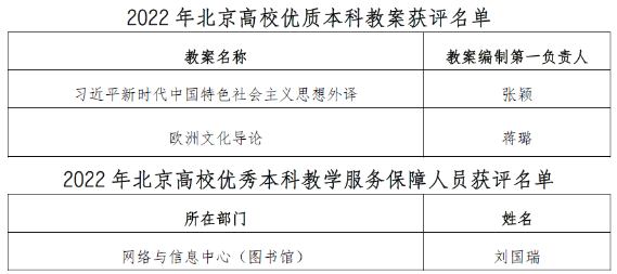 近日,北京市教育委员公布了2022年北京高校“优质本科教案”评选结果和2022年北京高校“优秀本科教学服务保障人员”评选结果,我校共荣获3项北京市本科教学奖项。具体名单如下: